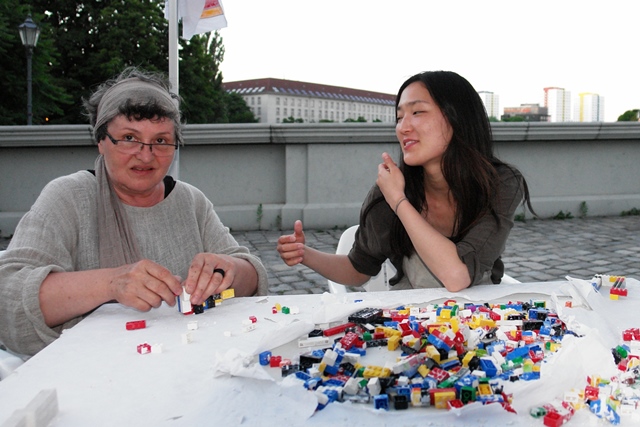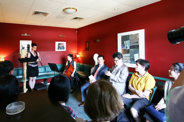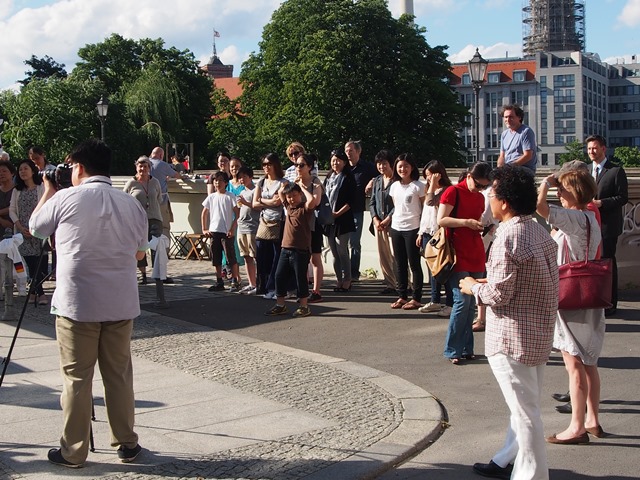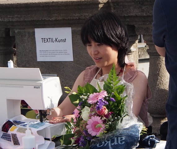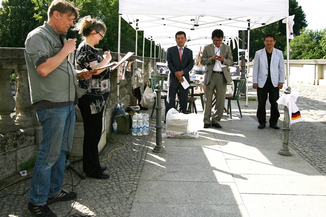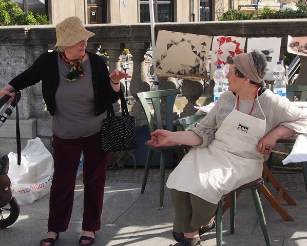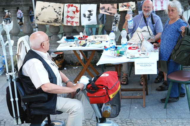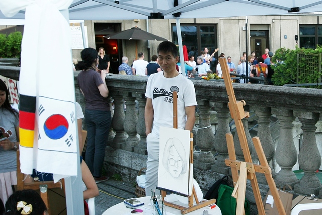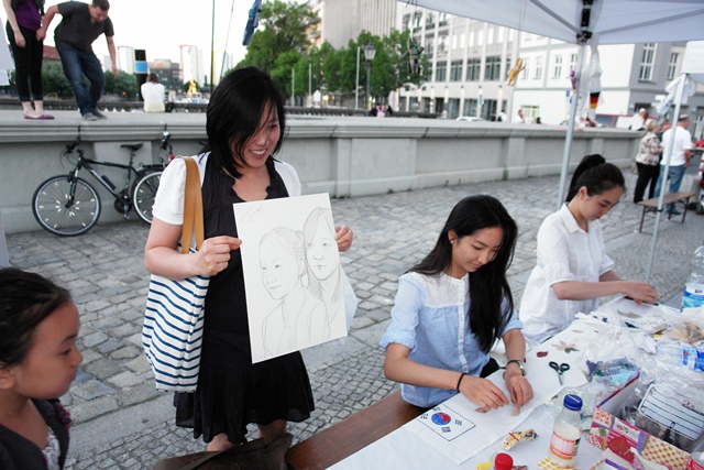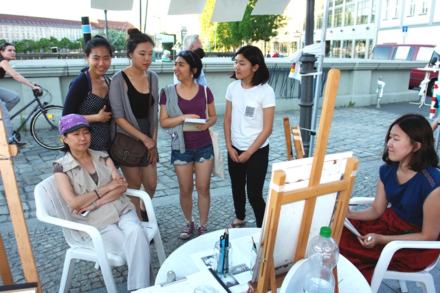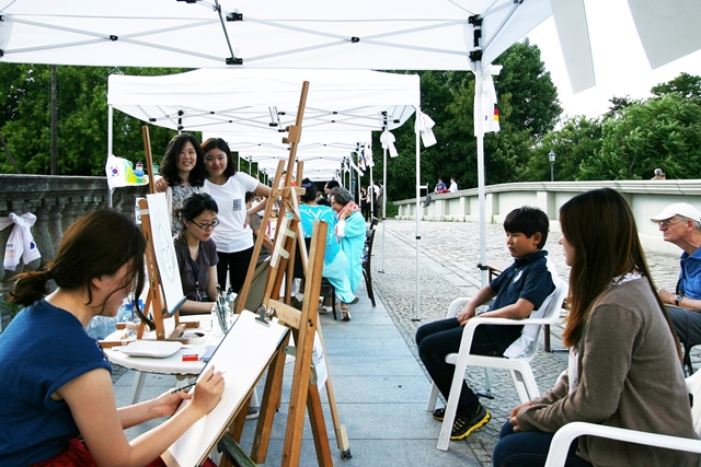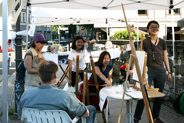 im Café Re und ließ sich von Herrn Junggeun Oh durch die kleine Ausstellung der BRÜCKEN-Künstler führen. Herr Kim freute sich sichtlich über die freundschaftliche Verbindung von koreanischen und deutschen Künstlern und Organisatoren im Kiez „Fischerinsel“ mitten in Berlin.