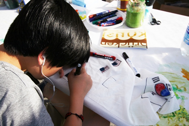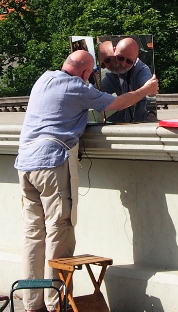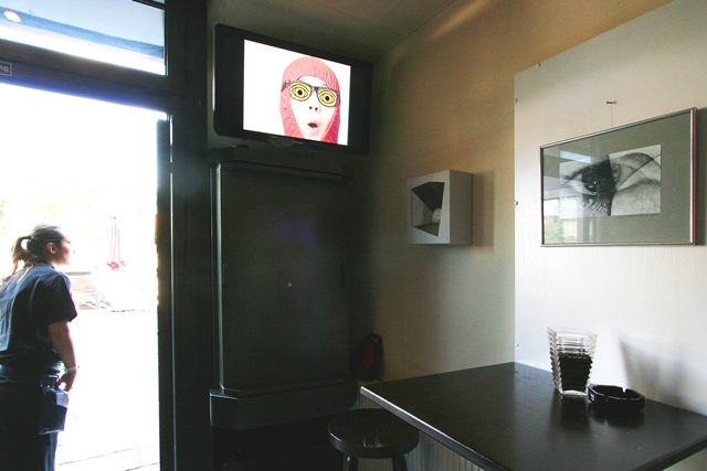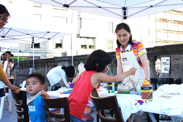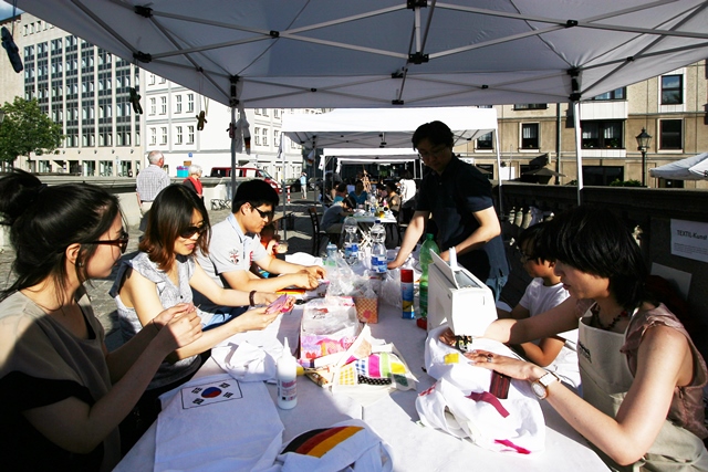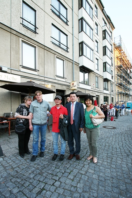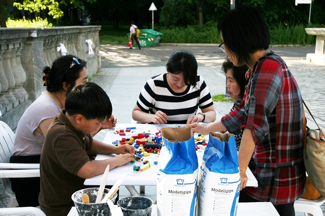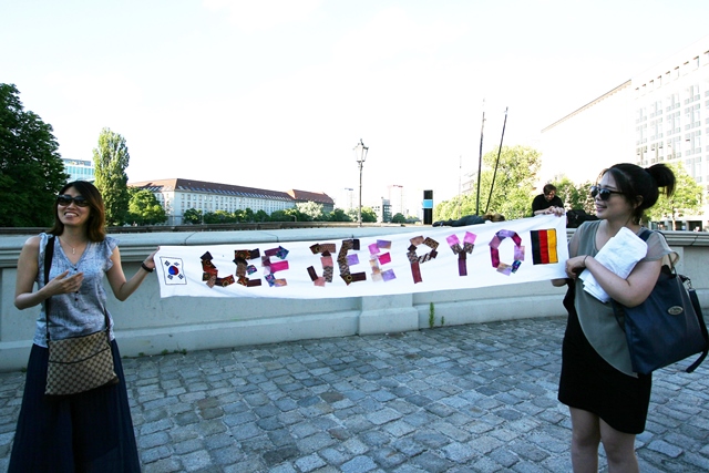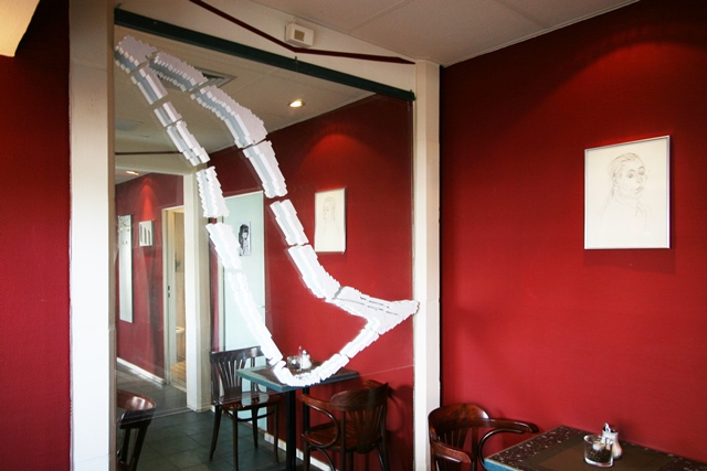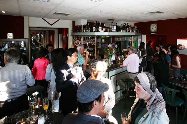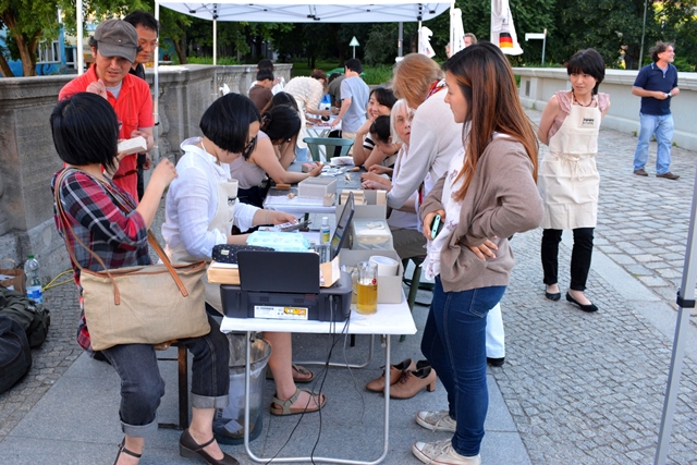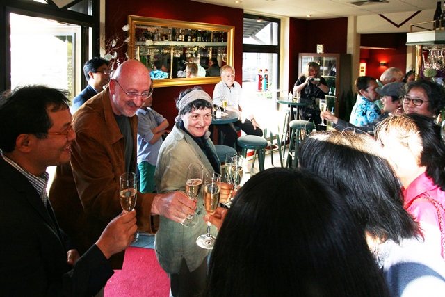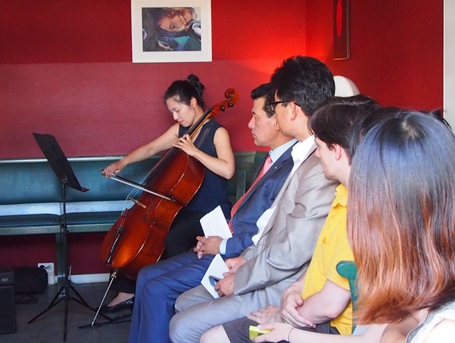 im Café Re und ließ sich von Herrn Junggeun Oh durch die kleine Ausstellung der BRÜCKEN-Künstler führen. Herr Kim freute sich sichtlich über die freundschaftliche Verbindung von koreanischen und deutschen Künstlern und Organisatoren im Kiez „Fischerinsel“ mitten in Berlin.